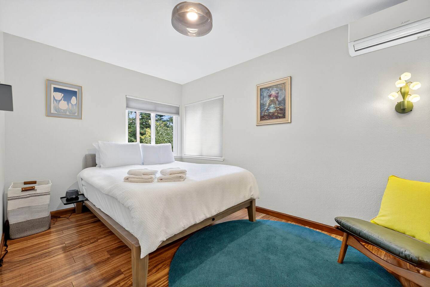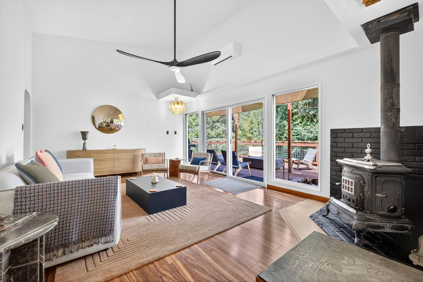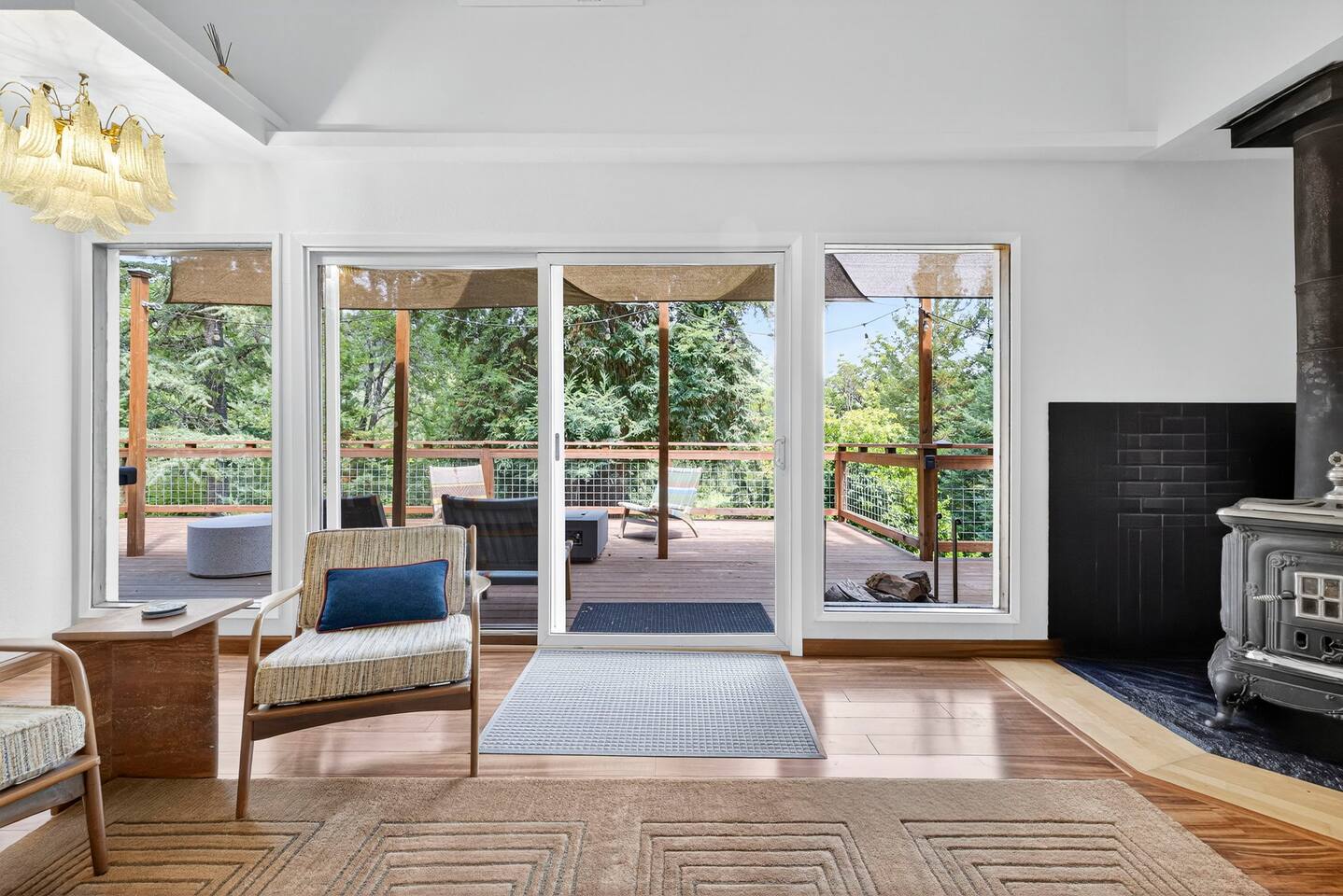 River Rose is a private, riverfront home nestled among the redwoods along the scenic Russian River in beautiful Forestville, California. The property features a spacious back deck with a propane BBQ grill and fire pit, an expansive back yard with numerous fruit trees (help yourselves!), and a private staircase providing seasonal river access, including our own private beach area available for your use in summer months through early fall. The home offers a well-equipped kitchen and dining area, spacious living room with wood-burning stove (wood and kindling supplied), two queen bedrooms, a third bedroom with two twin beds, two full bathrooms (including all essentials), and laundry machines (supplies provided). Whole house climate control, high speed WiFi, and complimentary EV charging are provided for your comfort and convenience. River Rose is conveniently situated just off of River Road, with easy access to shopping and essential services in downtown Forestville (4min), Guerneville (10min), and a short drive to numerous area attractions including picturesque public beaches and parks, Burke's Canoe Trips (2min), the famous Armstrong Redwoods reserve (15min), world class wineries in all directions, an array of excellent dining options, hiking trails, and the breathtaking northern California coastline. See our house guide for a comprehensive list of area recommendations and day trip ideas, or work with our local hospitality manager to plan the perfect itinerary. You'll enjoy complete, exclusive use of the property and its amenities throughout your stay. The property includes free level-2 EV charging and free on-site parking for two vehicles. Additional parking is available along the main road across from the property's entrance. River Rose sits on an acre of land, with a number of mature fruit trees on site. Please help yourselves to apples, lemons, cherries, blackberries, figs, grapefruit, pears and plums when they're in season! PLEASE NOTE: All accessible living spaces are located on the second floor; climbing stairs is a must (but we promise the views are worth it!) Sonoma County License: LIC24-0497 TOT: 4904